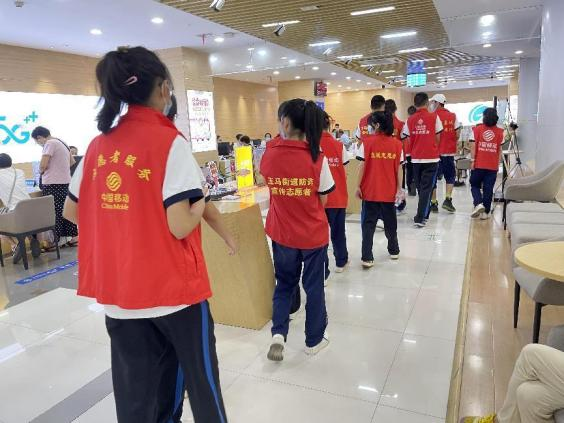 接着带大家来到二楼的客户引导区,让学生们在引导岗位体验为客户们提供取票、业务分流的工作;在业务咨询区,了解业务办理流程、为客户们提供业务办理咨询的工作;在智慧家庭区,看到了5G技术为我们生活方方面面带来的各种便利。最后大家来到了厅内“移动之家”站点,这里是以户外劳动者为主要服务对象,面向站点周边有需求的群众开放,旨在为户外劳动者创造一个方便快捷、服务优质的休息环境的服务站点。刚好人民路营业厅最近提供避暑服务,免费为前来休息的户外劳动者发放冰袖等避暑物品,学生们在发放冰袖的同时,也能了解到辛勤劳动的环卫工人、外卖小哥们的工作辛苦。 随着社会的进步,孩子们有了更好的生活条件,缺少了辛勤劳动的动力;有了更多了解社会的渠道,缺少了切身体验的机会。温州移动携手举办本次暑期实践活动,学生们体验了营业厅内引导岗位、终端销售岗位、自助服务业务咨询岗位、安全防疫岗位的工作,让学生从课本中走出来,在亲身体验中了解科技发展,在好奇心的驱使下发散思维。或许他们中有人的心里会有科学家、营业店长、引导员、志愿服务者等职业的种子在生根发芽,会在未来的某一天开出一朵花。