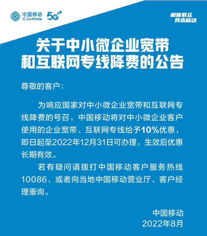 【关于中小微企业宽带 和互联网专线降费的公告】为响应国家对中小微企业宽带 和互联网专线降费的号召,中国移动将对中小微企业客户使用的企业宽带、互联网专线给予10%优惠,即日起至2022年12月31日可办理,生效后优惠长期有效。若有疑问请拨打中国移动客户服务热线10086,或者向当地中国移动营业厅、客户经理垂询。